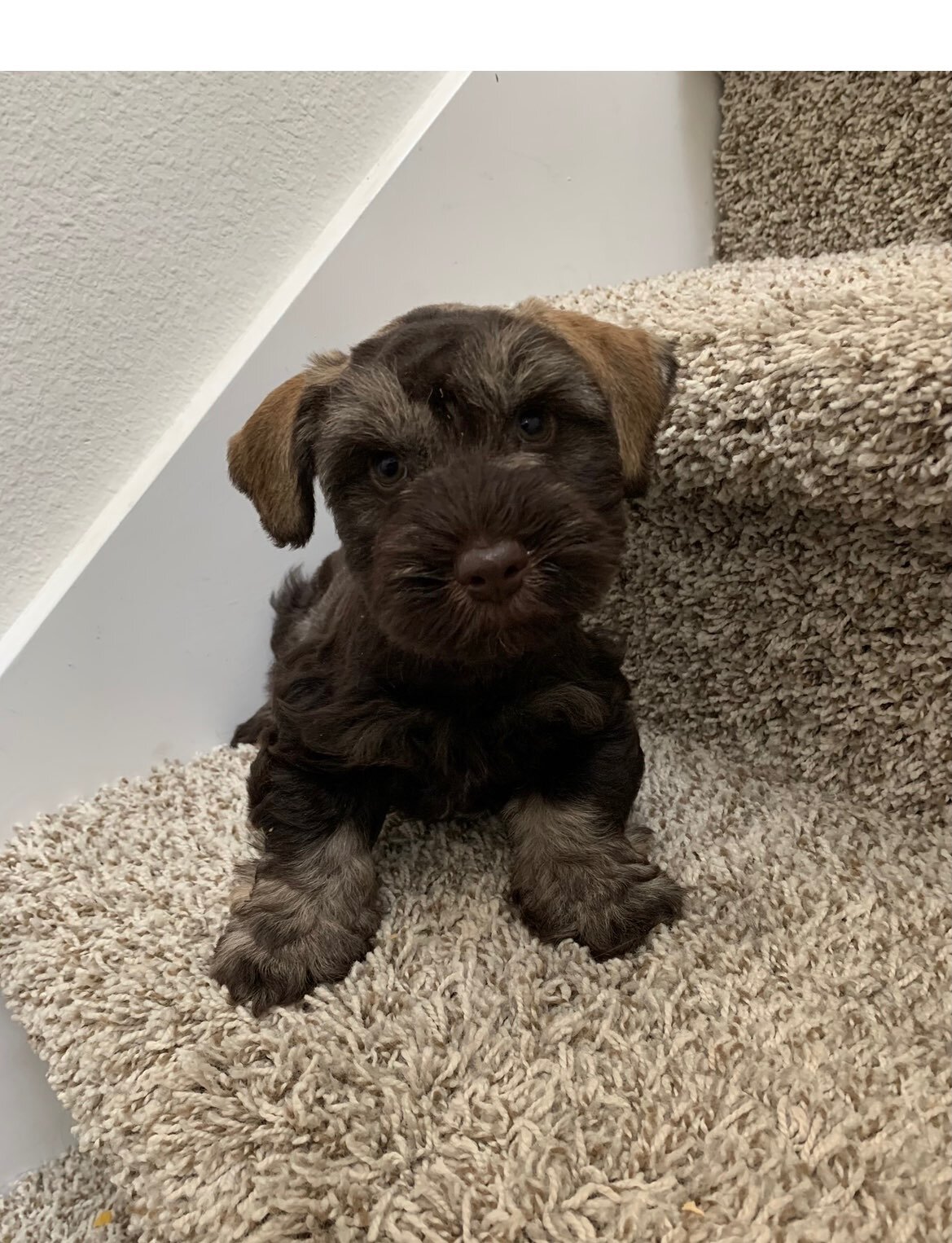 Frodo is a smaller Liver Mini schnauzer with mega coat and Duchess is a black regular size mini schnauzer. These dogs have wonderful personalities and beautiful babies!